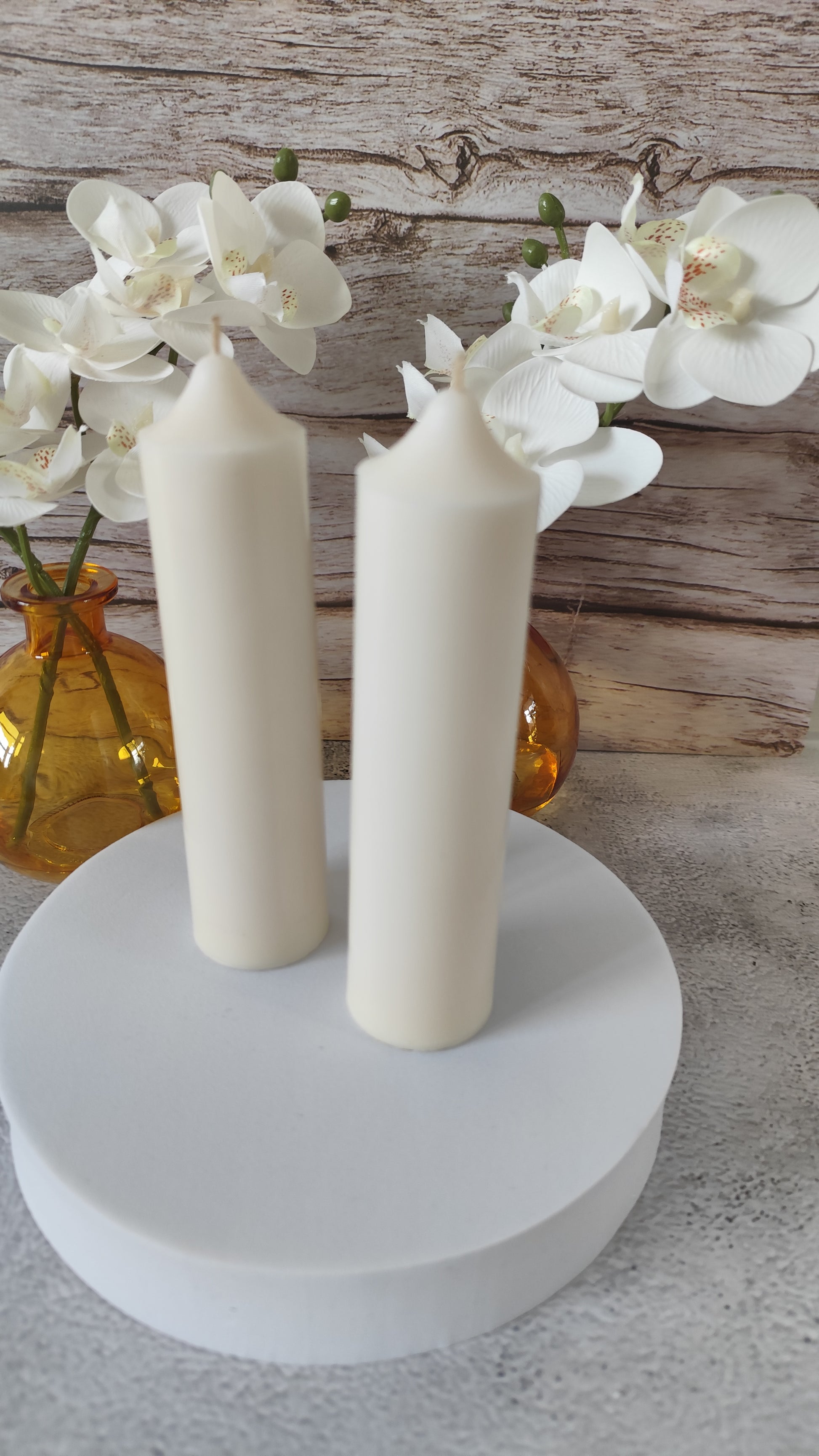 Our Ivory pillar candles are sold as a set of 2 and come in 4 different sizes: 10cm, 13cm, 15cm and 17.2cm.