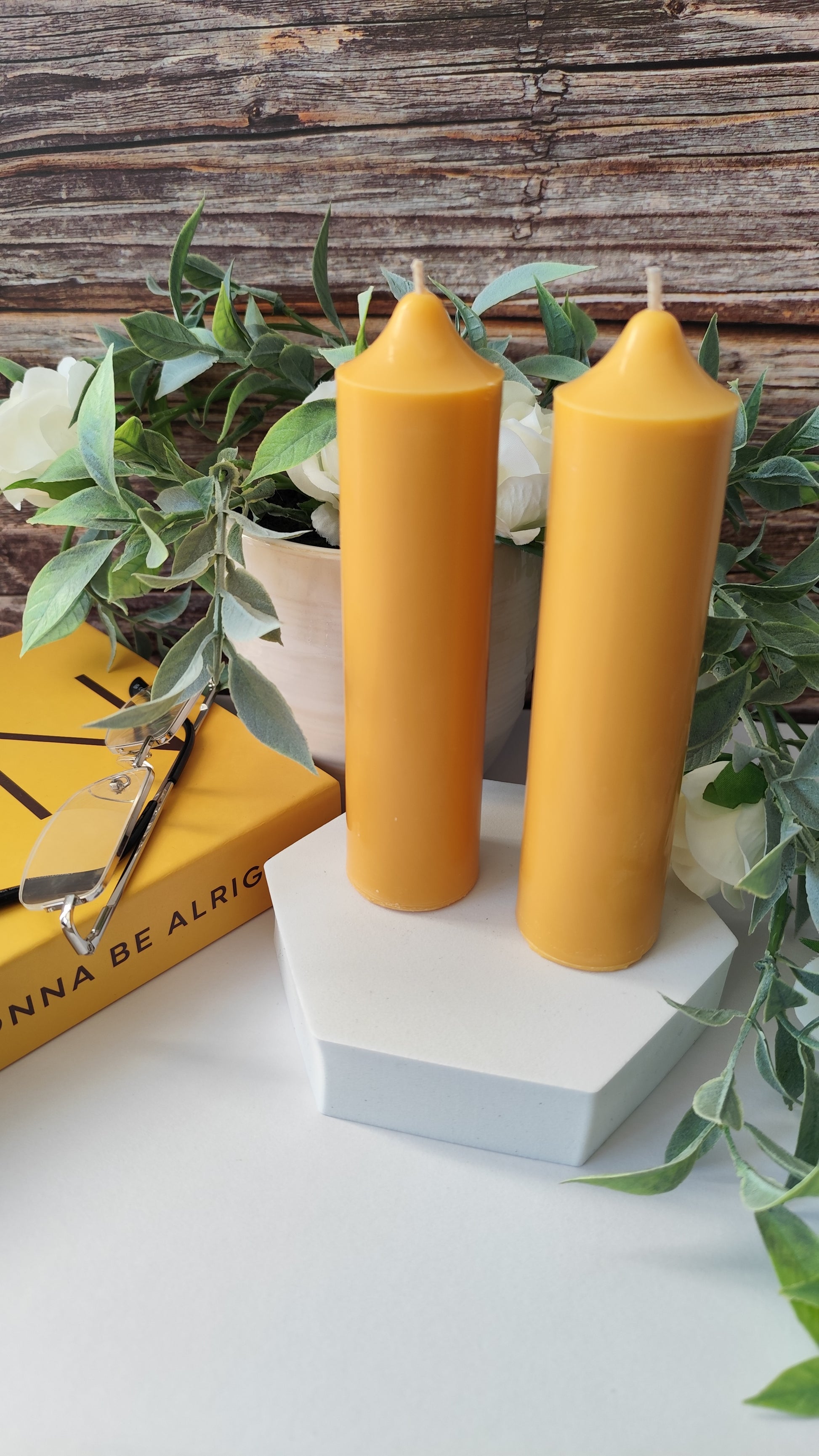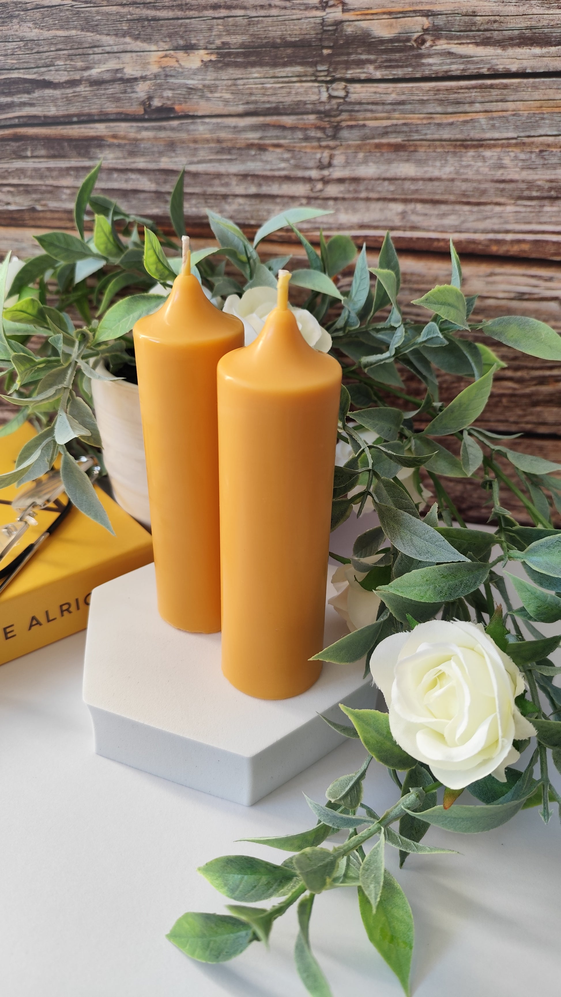 Our Orange pillar candles are sold as a set of 2 and come in 2 different sizes: 10cm & 15cm